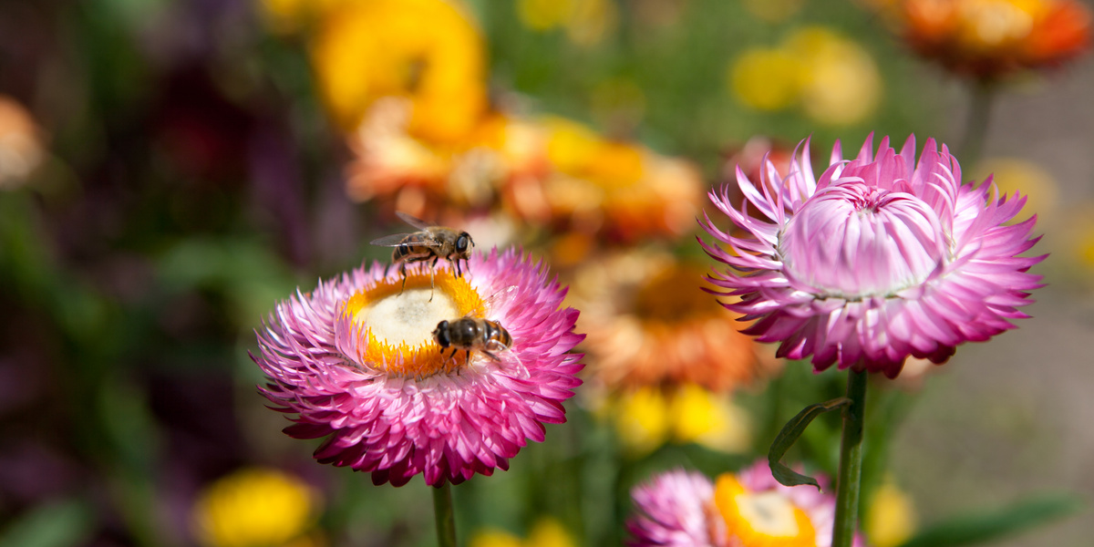 Nein, einheimisch ist die Strohblume definitiv nicht bei uns. Ihre Heimat ist Australien. Trotz ihrer sehr fernen Herkunft, dient sie aber auch bei uns zahlreichen Insekten als Nahrung. Vor allem verschiedene Schwebfliegenarten beobachte ich immer in grosser Zahl darauf. Allerdings sind die Insekten nicht mein Hauptargument, um Strohblumen anzubauen. Sondern ich mag ihre Farbenpracht und ihre Langlebigkeit, welche schon unsere Urgrosseltern schÀtzten.