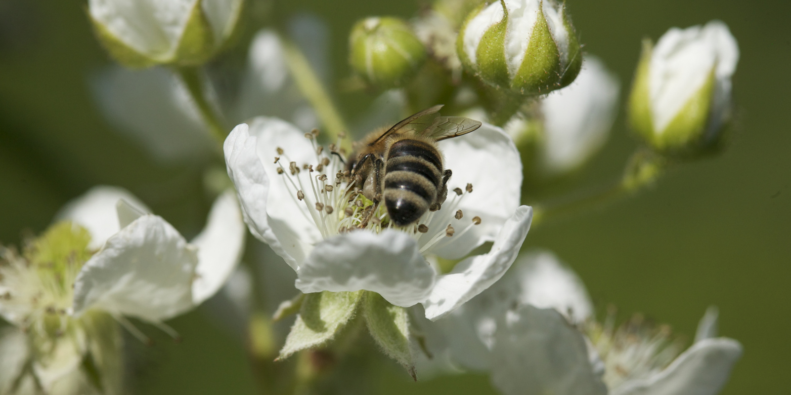 Zuletzt im Blütenreigen kommen dann im Sommer auch die Brombeeren zum Tragen mit reichlich Nektar und Pollen an ihren üppigen Blütenständen. Diese sind ebenfalls bei Honigbienen besonders beliebt. Es lohnt sich für unsere geflügelten Freunde, wenn überzählige Fruchtstände erst kurz nach dem Verblühen zur Ertragsregulierung weggeschnitten werden.