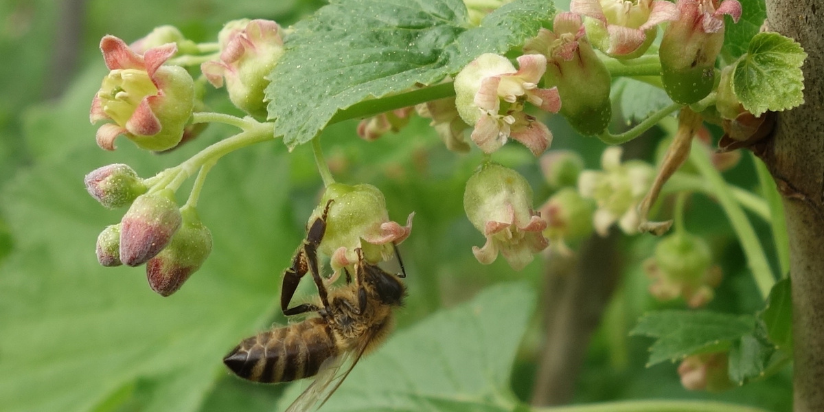 Stachelbeeren gehören zu den frühesten Blühern in Kulturen nördlich der Alpen. Schon im März öffnen die Sorten europäischer Abstammung ihre relativ unscheinbaren Blüten. Also in einer Zeit, in der sich die ersten Fluginsekten nach der Winterruhe auf Nahrungssuche begeben. Mit einer weisslichen bis grünlichen Grundfarbe, dezenten Rottönen und vereinzelt sitzender Anordnung verschwinden sie visuell teilweise fast im zuwachsenden Laub. Die becherförmigen bis glockigen Blüten sind vor allem ein gefundenes Fressen für Hummeln und manche Bienenarten mit längeren Rüsseln, wie die Honigbiene. Ein ähnliches Besucherspektrum wie die Stachelbeeren ziehen später auch die bauchig-glockigen Cassisblüten an. Besonders bei Hummeln sind sie sehr beliebt. Sie sind vielzähliger und sogenannt traubig angeordnet, daher zumindest für unsere Augen etwas auffälliger.