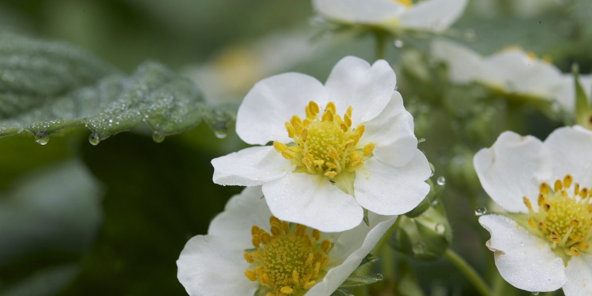 Erdbeeren bilden im April ebenfalls Scheibenblumen aus, die mit blendendem Kontrast von weither Interessierte anlocken. Die Blüten produzieren vor allem Pollen und keinen oder wenig Nektar. Besucht werden sie vor allem durch Bienen, Hummeln, Schwebfliegen und Käfer in kleinen oder auch grösseren Varianten. Vertreter aus der Gruppe der Rosenkäfer besuchen die Blüten gelegentlich und sogar Schmetterlinge machen bei nektarführenden Arten manchmal Halt. Von den kleinblütigen, ursprünglicheren Wald-Erdbeeren profitieren Wildbienen besonders und auch Tanzfliegen sind hier gern gesehene Gäste. Bei Erdbeeren hat der Bestäubungserfolg auch grossen Einfluss auf die Fruchtform: Schlecht bestäubte Blüten erbringen deformierte Früchte. Es ist deshalb ganz im Sinne des Beerenanbaus, dass die Vielfalt lebt.